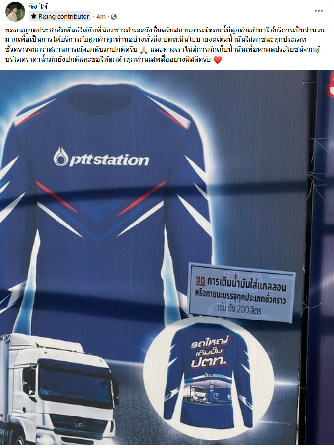 เช้าวันนี้ บรรยากาศหน้าปั๊ม PT ในตัวอำเภอ (ข้างศูนย์ราชการ – ไปรษณีย์) ดูคล้ายฉากในหนังภัยพิบัติขนาดย่อม ที่ผู้คนจำนวนมากขับรถออกจากบ้านตั้งแต่เช้า หลังมีข่าวลือเรื่องน้ำมันอาจขาดแคลน ทำให้ถนนหน้าปั๊มแน่นขนัด รถยนต์ รถจักรยานยนต์ ต่อแถวกันยาวเหยียดเกือบ 100 เมตร เหมือนงูเหล็กที่เลื้อยช้า ๆ อยู่ริมถนน